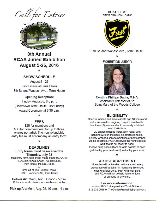 River City Art Association and host sponsor First Financial Bank invite Wabash Valley artists to enter RCAA’s Eighth Annual Juried Exhibition to be featured in the bank’s main branch at Sixth Street and Wabash Avenue.
