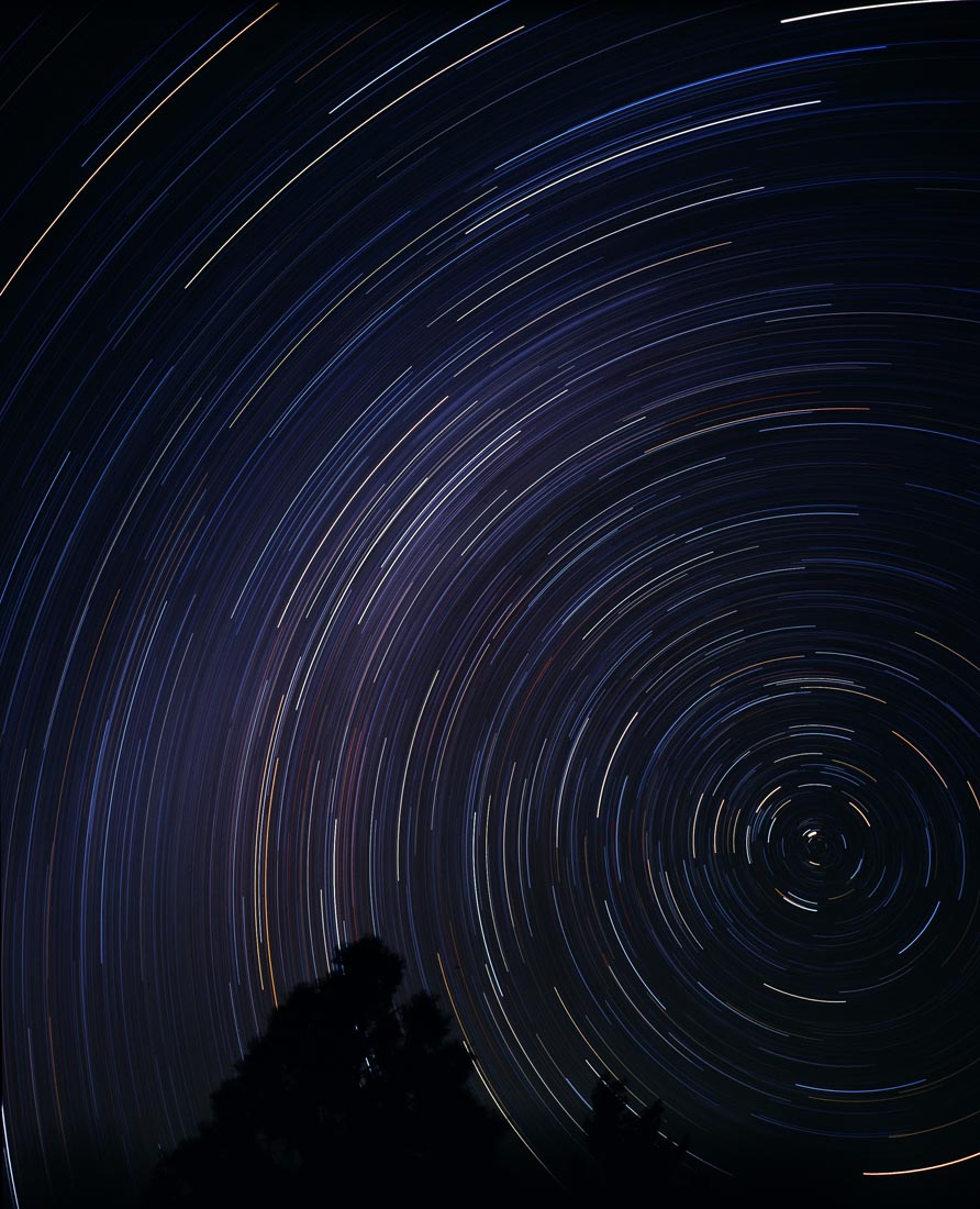 The central theme in Young’s exhibit is star trails — photographs that utilize long-exposure times to capture the motion of stars in the night sky due to the rotation of the Earth.