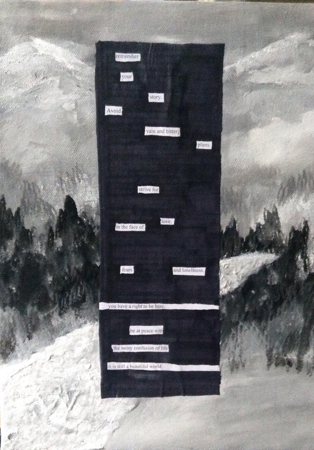 “Deside—-” by Elise Spaid-Roberts, blackout poetry and acrylic on canvas