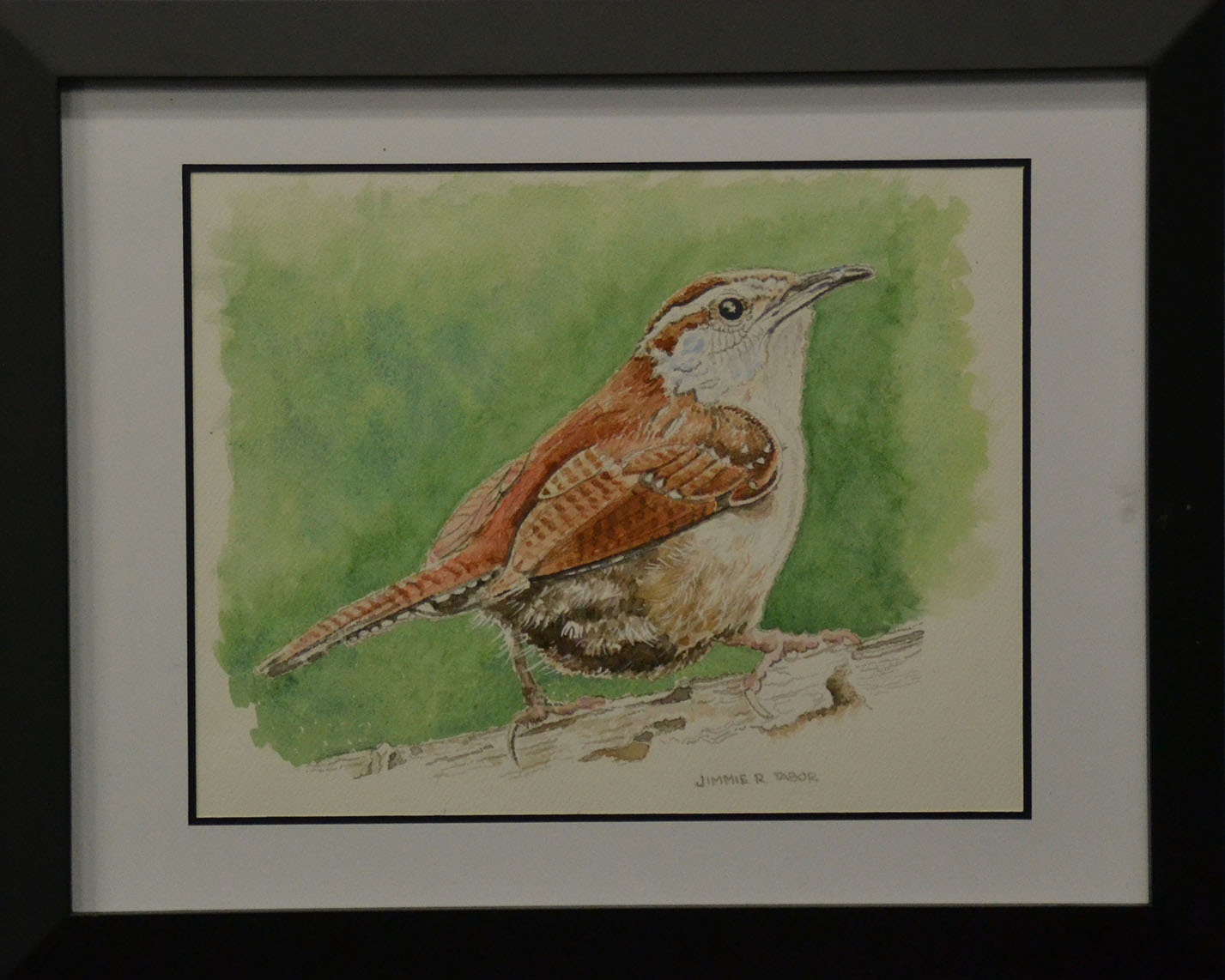 Jimmie has worked in several mediums, but has come to love watercolor because of “the pleasant surprises as the paints/colors change while drying.” His work primarily involves nature (birds, flowers, animals), landscapes and some portraits.