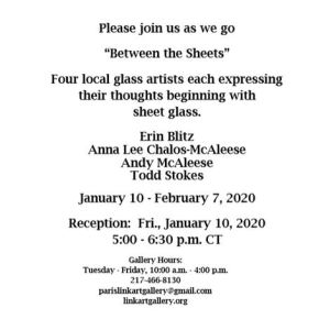 “Between the Sheets” in the Link Art Gallery in Paris, Illinois features River City Art Association’s Todd Stokes of Terre Haute who has a studio in Dennison, Illinois. One of his glass etchings in the exhibit is titled “Current Body of Work.”