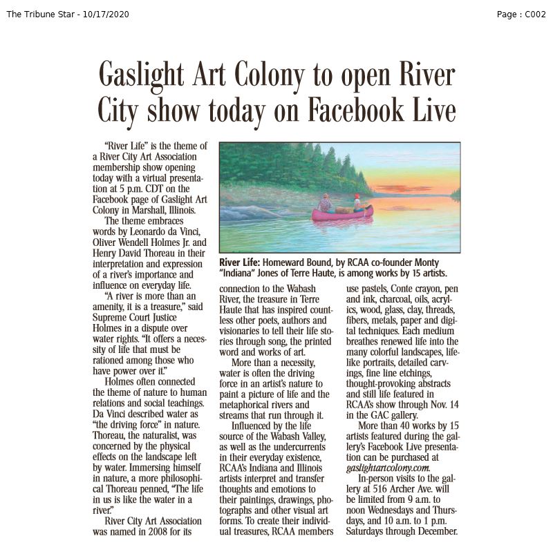 “River Life” is the theme of a River City Art Association membership show opening Oct. 17 with a virtual presentation at 5 p.m. CDT on the Facebook page of Gaslight Art Colony in Marshall, Illinois.