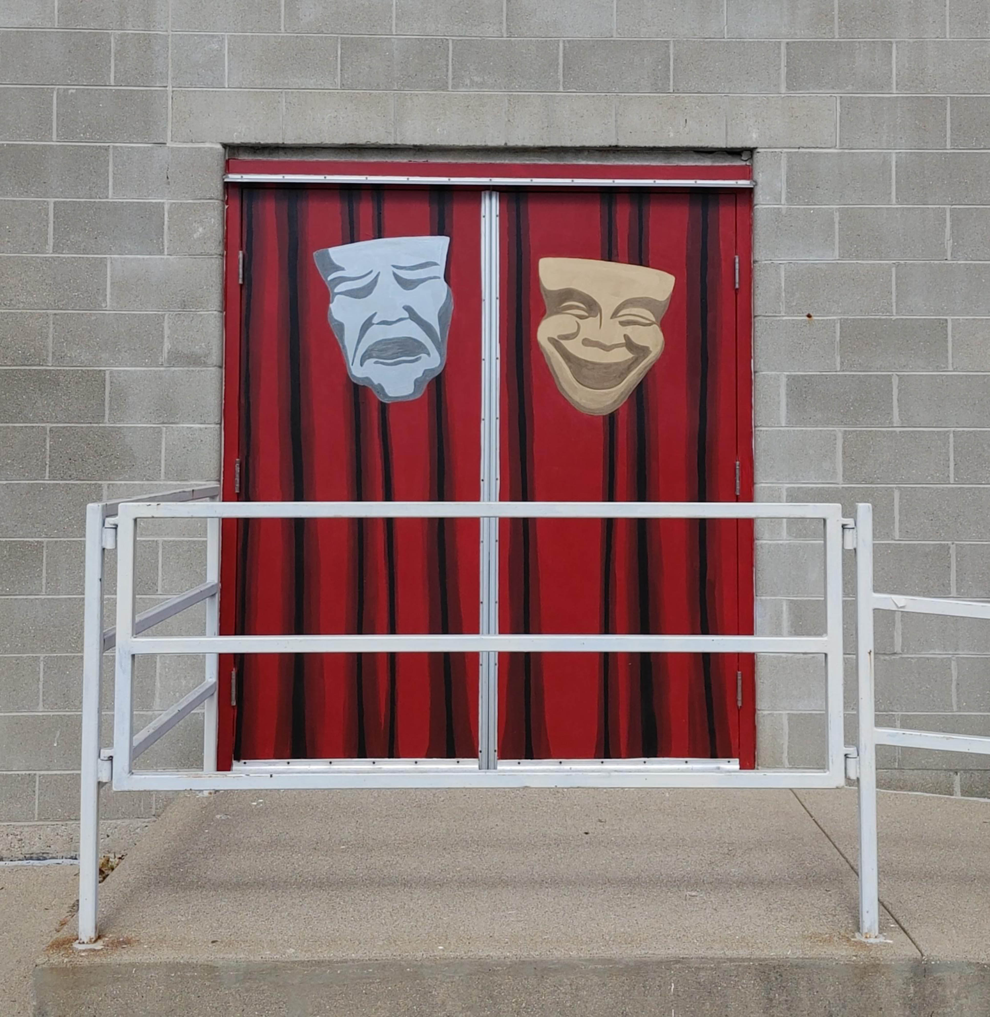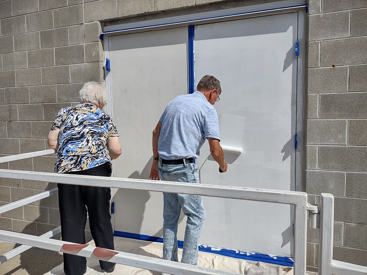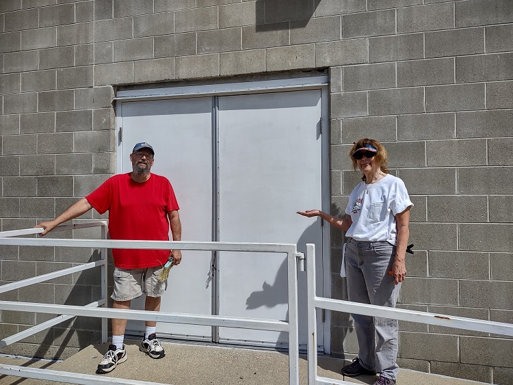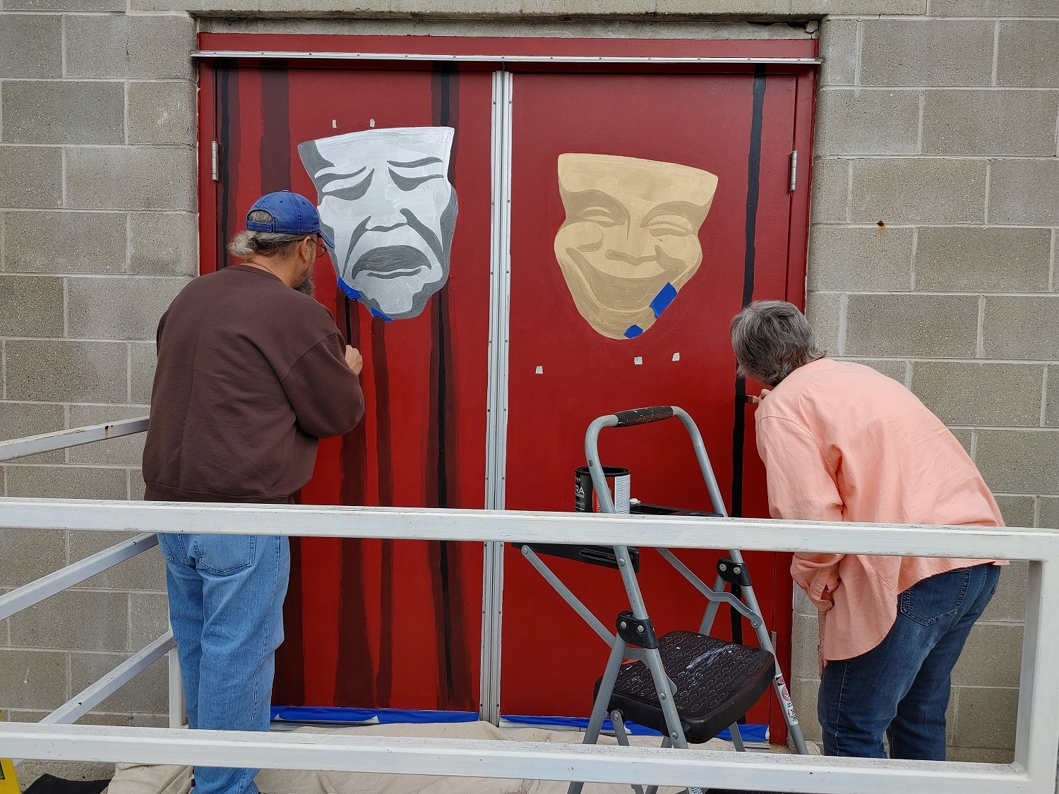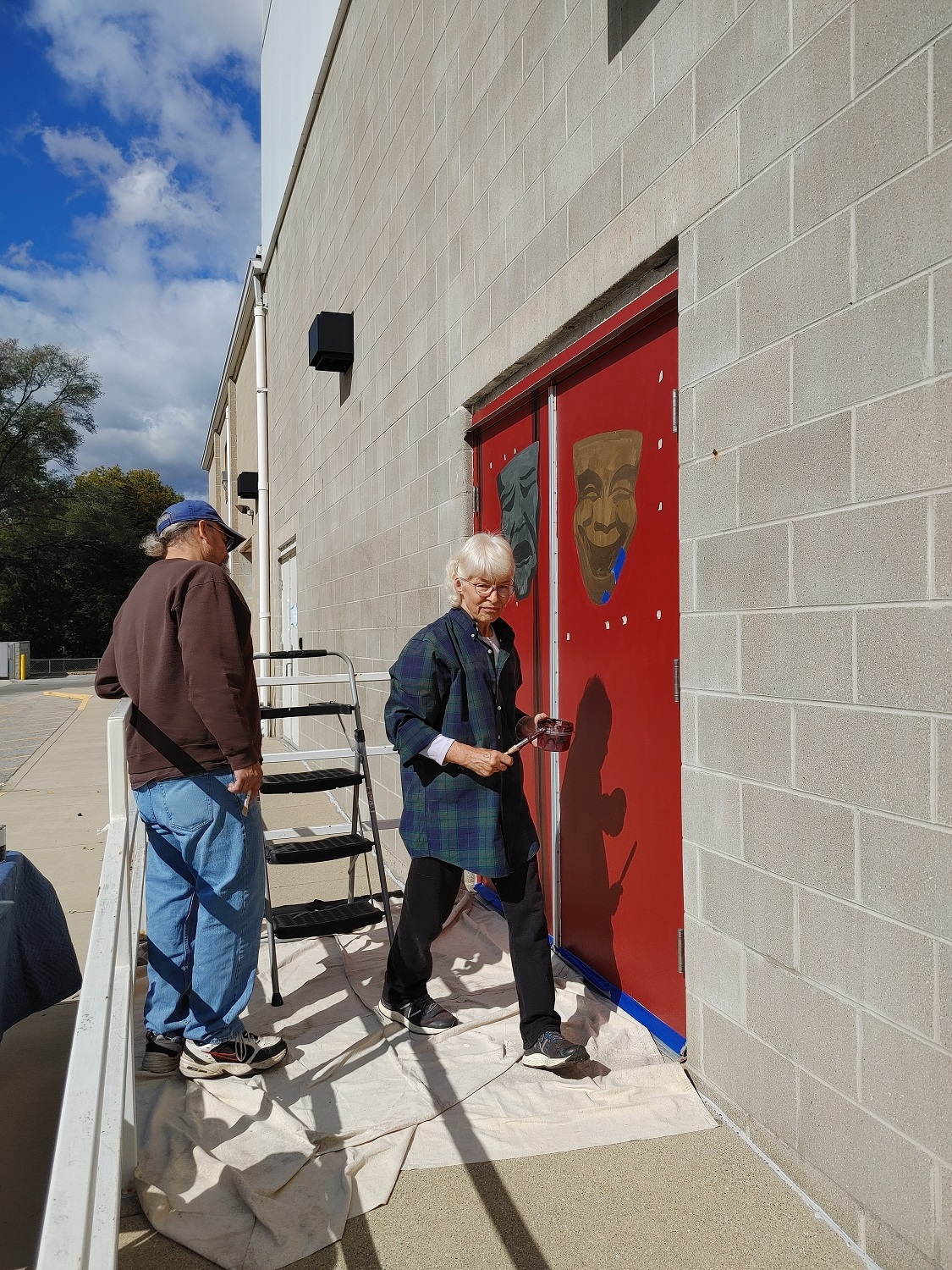 Members Edith Acton, Richard Acton and Debra Butler assisted Todd Stokes with cleaning and sanding the service doors for primer paint in August. Stokes and Butler later painted the service doors red so that Stokes and Mary Mayhew could proceed with work throughout September on the comedy/tragedy theater masks and drapes.