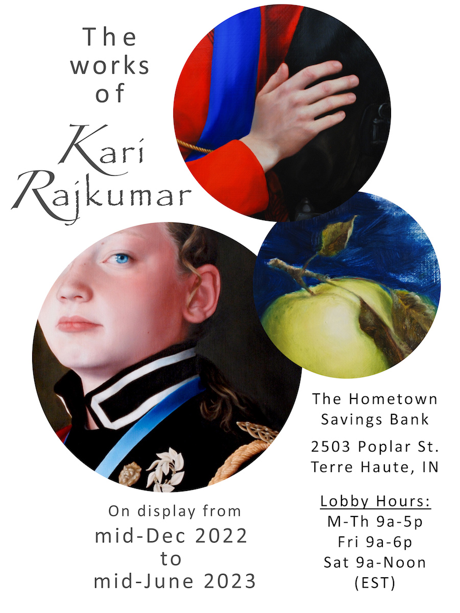 A selection of Kari Rajkumar’s artwork will be on display at the Community Outreach Gallery housed in The Hometown Savings Bank (THSB) located at 2503 Poplar St. in Terre Haute, IN. The show is scheduled to run from Dec 13, 2022, until mid-June, 2023.
