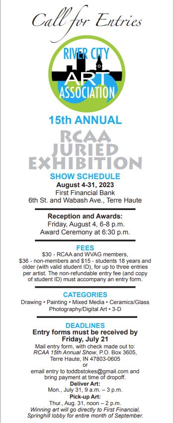 River City Art Association invites Indiana and Illinois artists to enter its 15th Annual Juried Exhibition to be on display Aug. 4 through 31 in First Financial Bank Plaza at Sixth Street and Wabash Avenue, Terre Haute, Indiana.