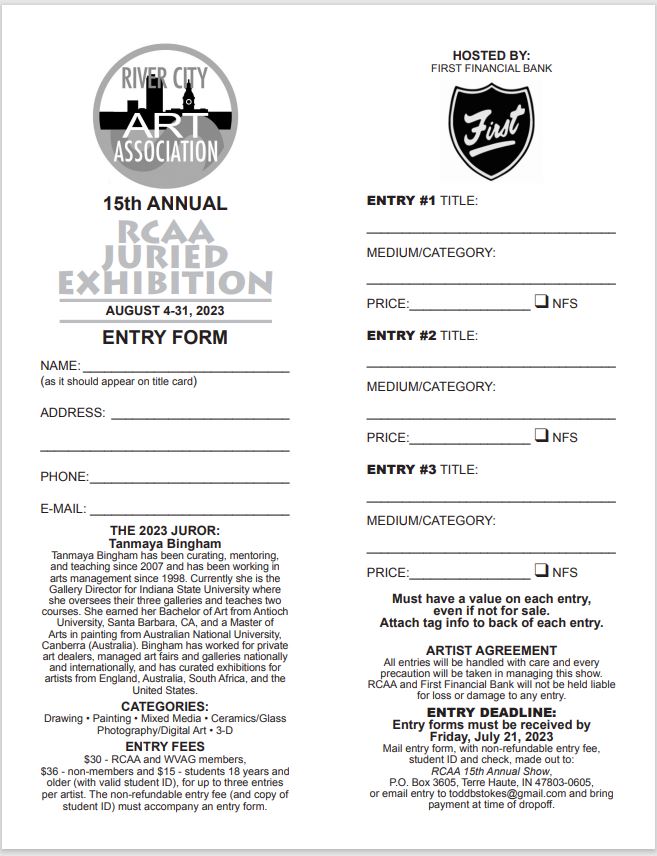 Fees are $30 for RCAA and Wabash Valley Art Guild members, $36 for nonmembers, and $15 for students (with valid student ID) for up to three entries per artist.