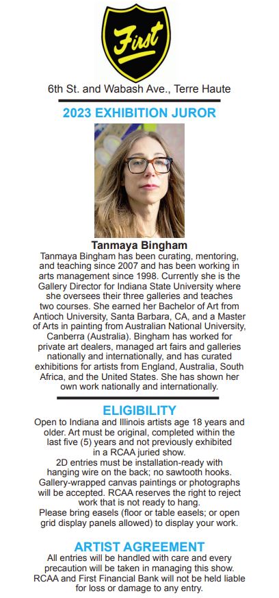 Exhibition juror is Tanmaya Bingham, gallery director for Indiana State University where she oversees three galleries and teaches two courses.
