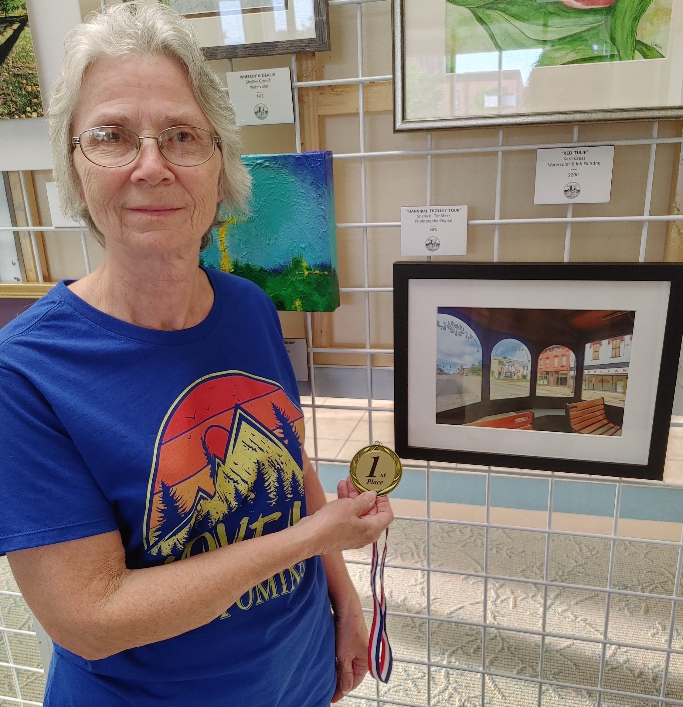 First-place medallions were awarded to Steve Harrold of Vigo County for his painting, “Laughter”; Jim Rhodes of Brazil for his drawing, “Tennessee Pass Colorado; Jan McVay of Tangier for her mixed media entry, “Wooded Den”; Elise Spaid-Roberts of Terre Haute for her 3-D entry, “Means To The End”; Todd Stokes of Dennison, Illinois, for his “Standing Proud” in the glass/ceramic category; and Sheila K. Ter Meer of Brazil for her photography entry, “Hannibal Trolley Tour.”