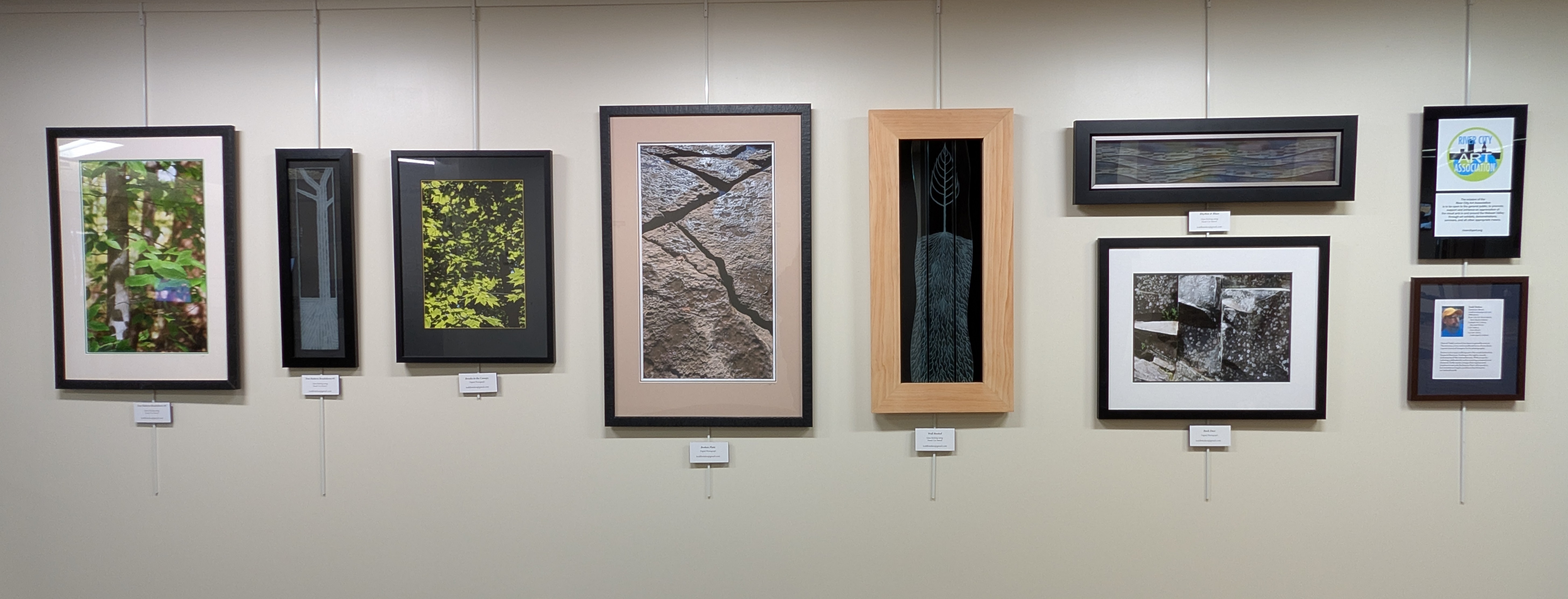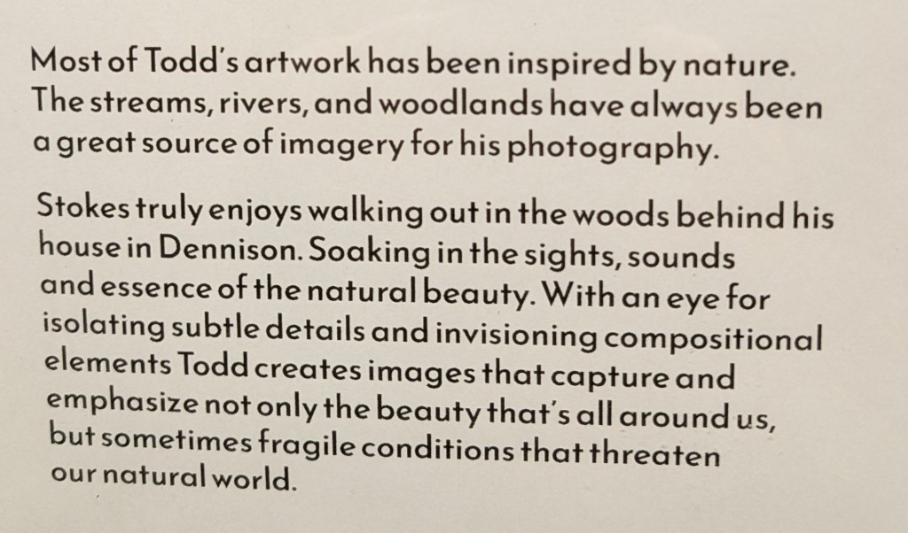Todd’s exhibit in the main lobby gallery space features four photographs and three etched glass pieces. Trees and rock formations are recurring themes in his artwork.
